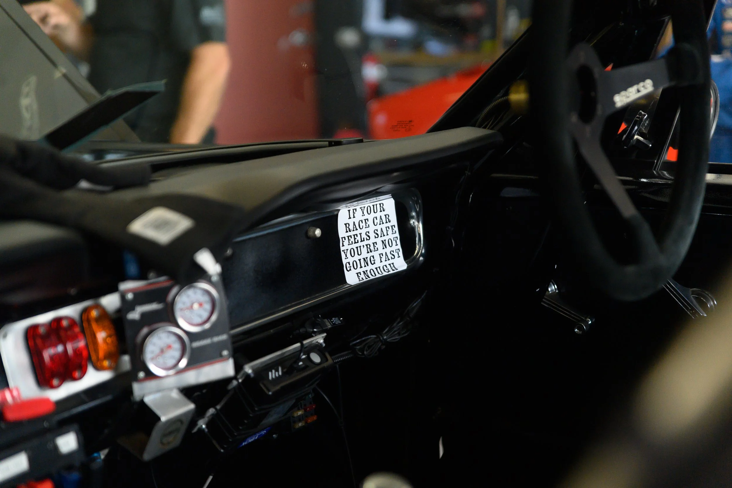 Close-up of a race car's front wheel with black sponsorship decals on the body.